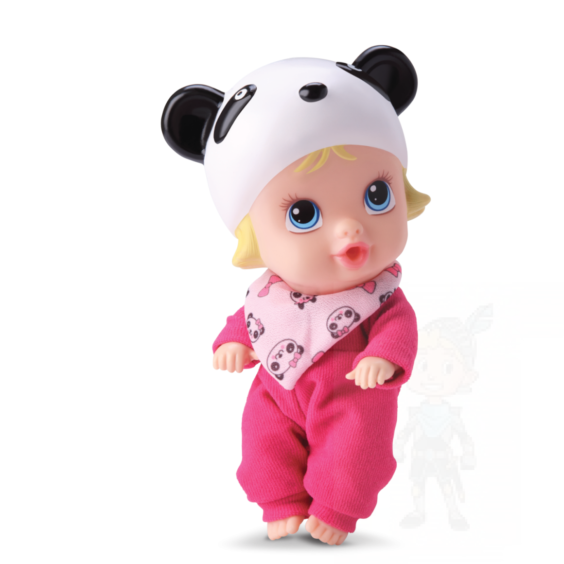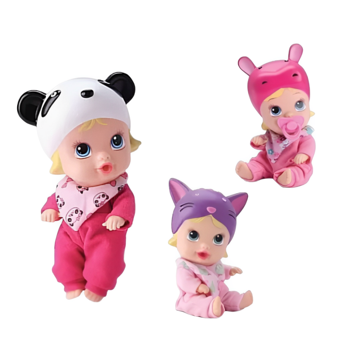 Com 20 cm de altura, essas lindas bonequinhas vêm com gorrinhos e bandanas de bichinhos, incluindo hipopótamo, gatinho e panda, tornando-as irresistivelmente estilosas e encantadoras.