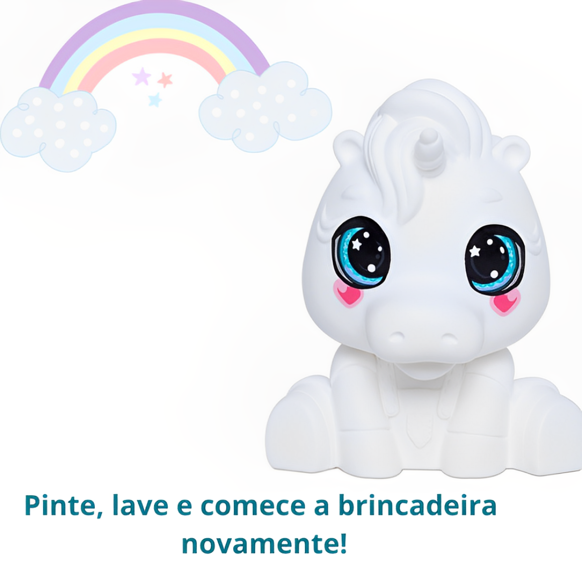 Ele acompanha 3 potinhos de tinta guache e 1 pincel para você colorir seu Unicórnio do jeito que quiser! Solte a imaginação!!